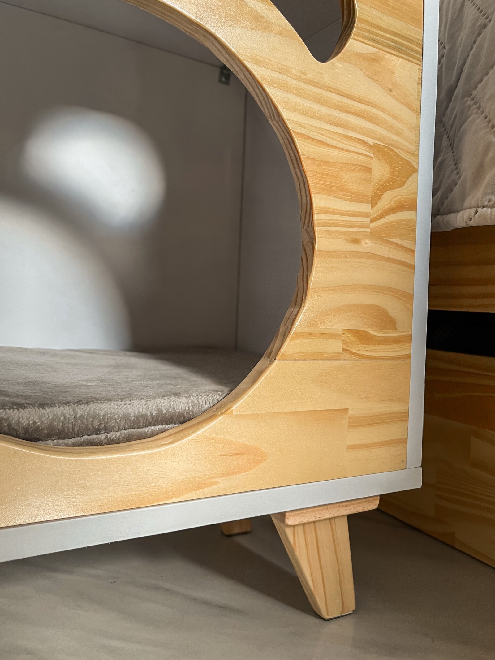 Esta mesa de noche para tu mascota incluye cojín anti fluidos anti rasguños! Disponible para mascotas pequeñas como tu gatito! Ellos la amarán! Y tú los tendrás siempre junto a ti! Fabricada en melanina y madera de pino! La mesa de noche más acogedora que encontrarás